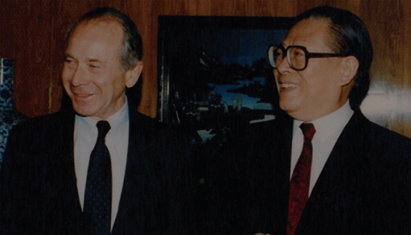 モーリス・R・グリーンバーグと、この年より中華人民共和国の最高指導者となる、江沢民との会談。