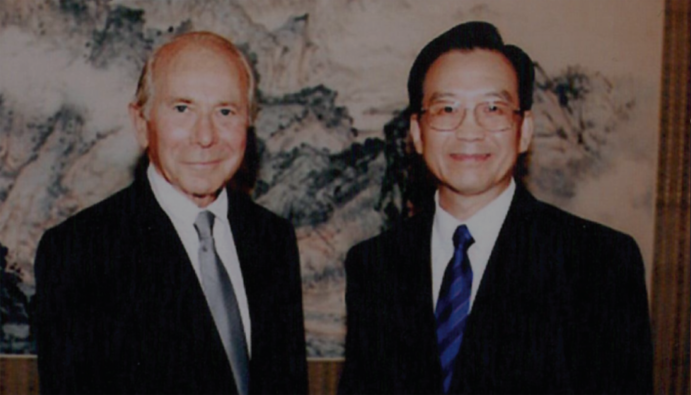 モーリス・R・グリーンバーグと、1991年まで上海市長を務め、その後1998年より中華人民共和国の国務院総理となった朱 鎔基との会談。